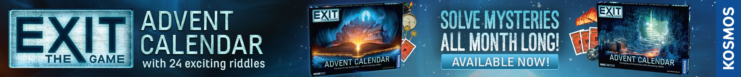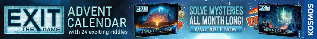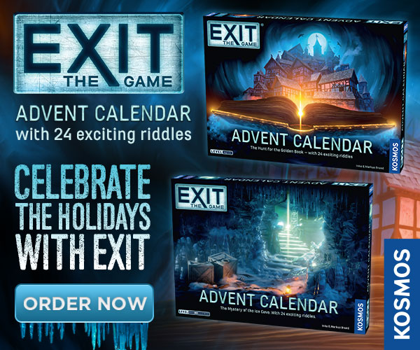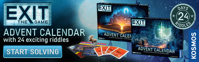| Text | EXIT: The Game turns FIVE this year! This fan-favorite series of at-home escape room games has been perplexing and delighting gamers (and non-gamers!) of all ages since 2017, and this year you can incorporate EXIT into your holiday traditions. Two EXIT advent calendars have finally made their much-anticipated trip overseas and are now available in the US and Canada. Order now to get it by December 1st! (Or just play any month...really, is there ever a wrong time to play EXIT?!). Each advent calendar has its own unique storyline with 24 riddles to solve, one day at a time. Solve one day's riddle to determine which door to open the next day. |