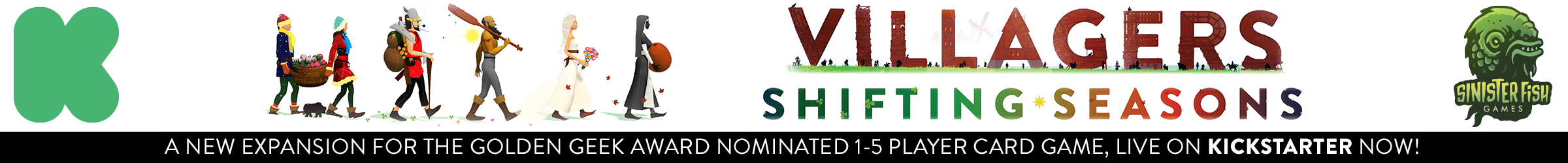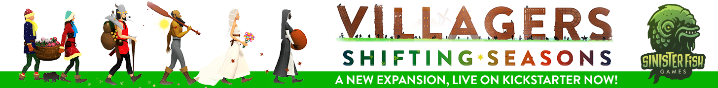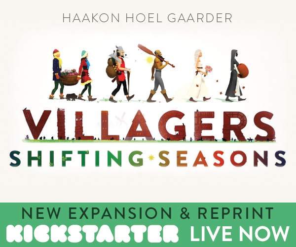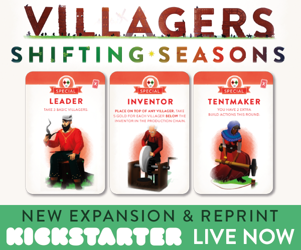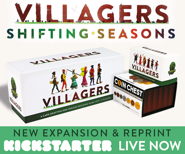 Description Golden Geek award nominated card game Villagers is back on Kickstarter with an all-new expansion adding new villagers, seasonal events, a new solo mode and more! Backers will get a free promo card pack with even more cool stuff! Also, being reprinted for the first time is the Villagers playmat and wooden coin set.