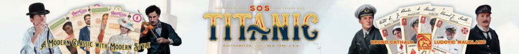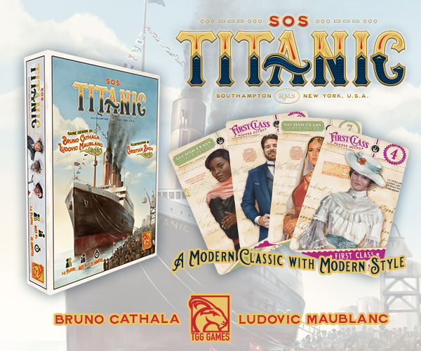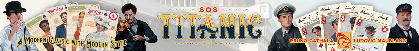 | Text | TGG-Games presents the deluxe reprinting of the hit game SOS Titanic, designed by the spiel winning designer Bruno Cathala and Ludovic Maublanc. A SOS Titanic reprinting has been long over due and will begin this year, featuring upgraded components and all new artwork. Preorders are now being accepted on this must have title, don't miss out! SOS Titanic plays 1 to 5 players and takes about 30 minutes to play. |
