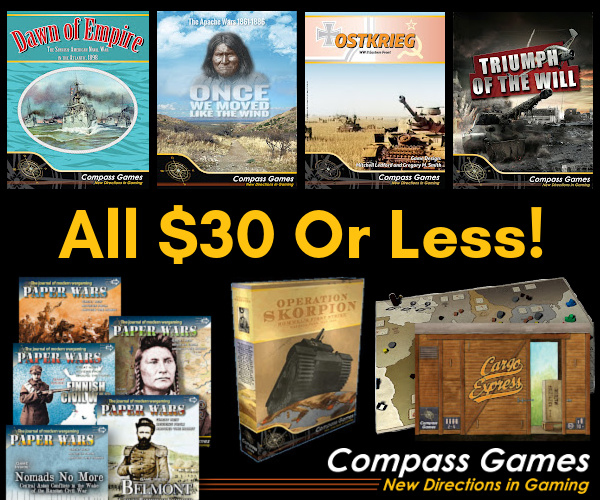 All $30 or less! Catalog sale ends January 31st at Compass Games. Featured Dawn of Empire, Once We Moved Like The Wind, Ostkrieg, Triumph of the Will, Paper Wars, Operation Skorpion, and Cargo Express. Save up to 70% sitewide! Annual Catalog Sale ends January 31st at Compass Games