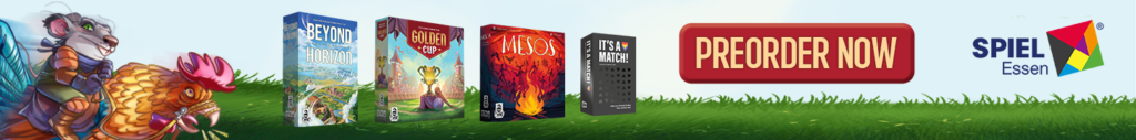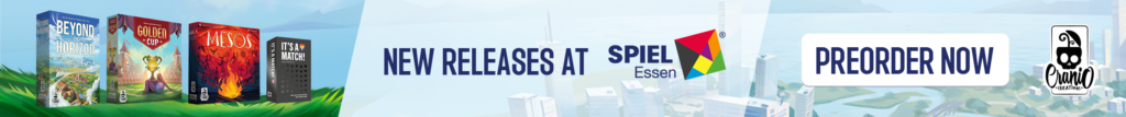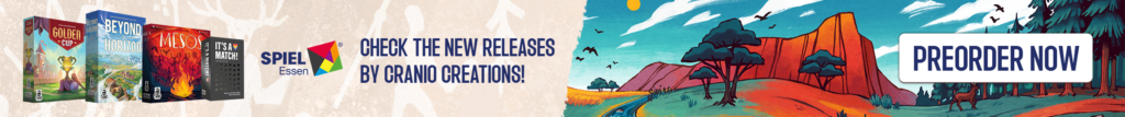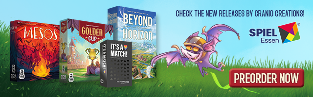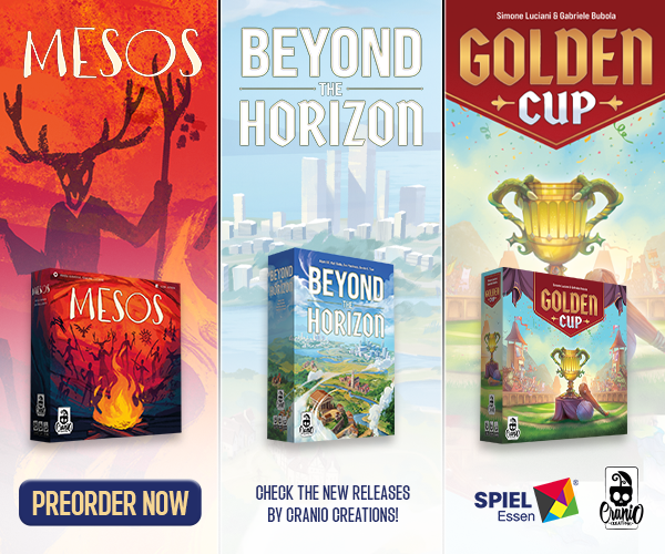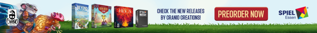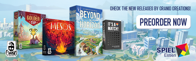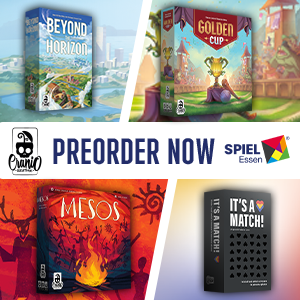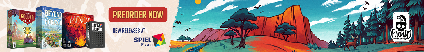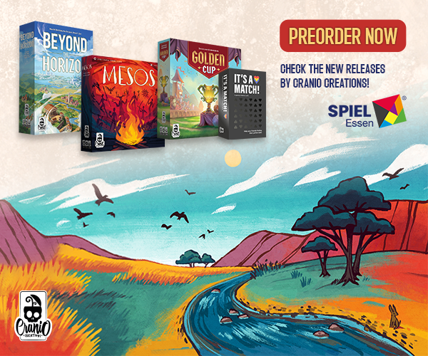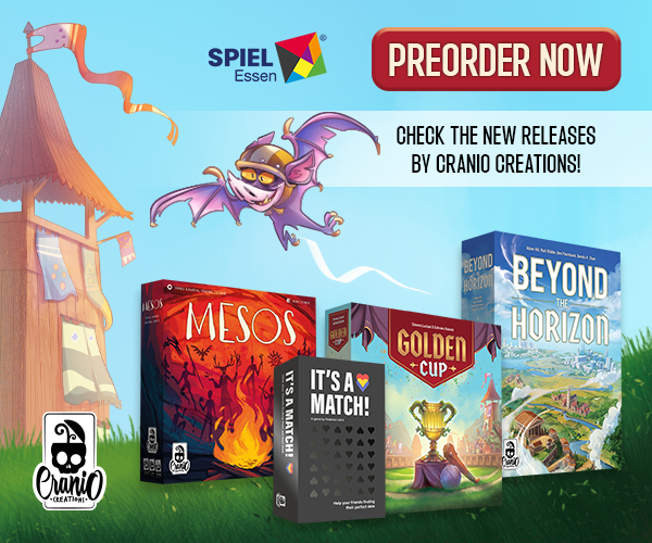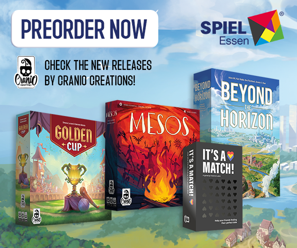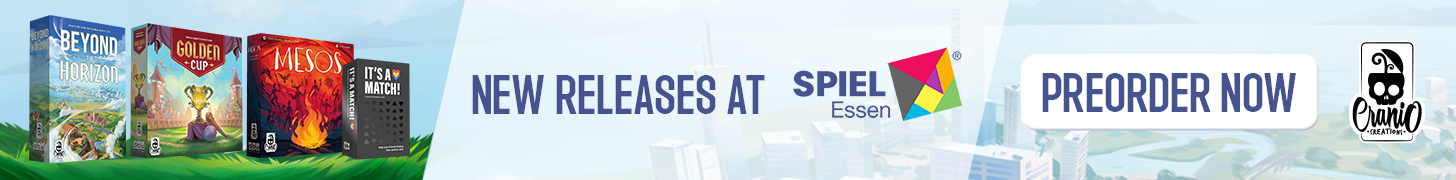 | Text | Don't miss the chance to get Cranio Creations New Releases at Spiel '24! Preorder the games now and get them directly at our booth (3V411) with the free promos. Choose your favourite: Beyond the Horizon - Become the most influential society in history! Golden Cup - Join the Fantasphere with your team! Mesos - Guide your tribe to victory! And It's a match - Find your soul mate! It's a joke you don't have to choose, you can get all of them!!! |