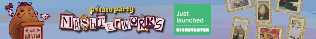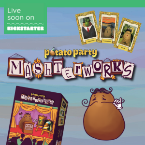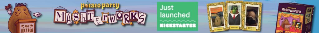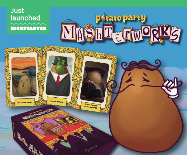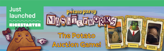 | Text | Just when you thought it was safe to bid... Potato Party: Mashterworks is a lightweight auctioneering party game for 3-8 players. Players begin the game with a single Painting, assigned a random value from the Value Points (VP) deck. During the game, paintings will be auctioned off, change value, and be traded around the table. When all available Paintings have been auctioned off, all players total up their VP. The player with the highest VP wins and thus may gloat about their superior taste in the fine arts. Perfect for potato and art fanatics alike! Launching on Kickstarter this Monday, September 23. |
