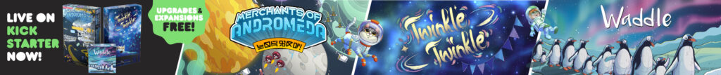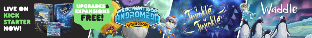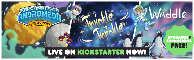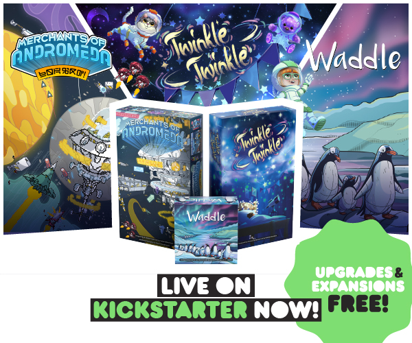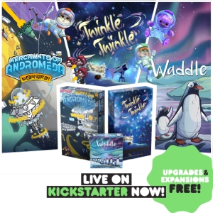| Description | Draft clickity-clackity, transparent tiles in Twinkle Twinkle. Play space politics, have tense Dutch auctions, and compete in intergalactic mini-games in Merchants of Andromeda. And catch fish and build routes while manipulating the turn order in Waddle. Back ALL-IN to get their expansions and upgrades FREE! |