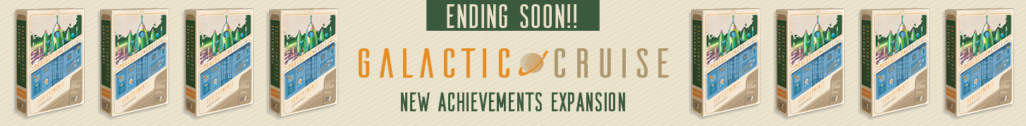 | Text | Galactic Cruise: Achievements Expansion & Reprint offers a campaign-adjacent experience for Galactic Cruise, where players will unlock exciting new content over a series of games as they accomplish goals. Powerful ability tiles, quirky asymmetric characters, a whole new mechanism featuring resident-genius Zoe, and a slew of new cards, tiles, and tokens are only some of the things you'll find as you unlock more than a dozen boxes in this expansion. This campaign also offers a reprint of all existing content for Galactic Cruise, the smash-hit 1-4 player worker placement game, including the custom playmat and deluxe bits. |