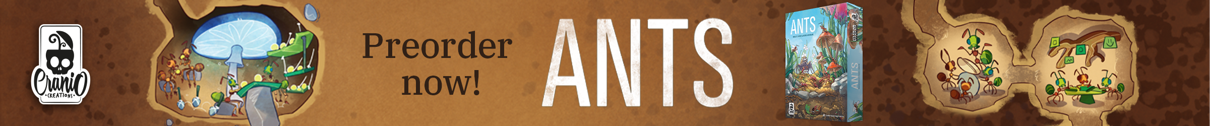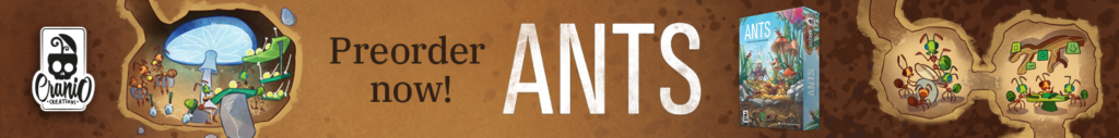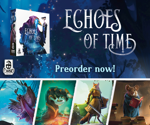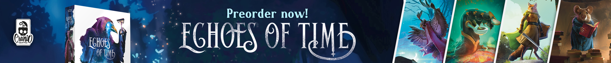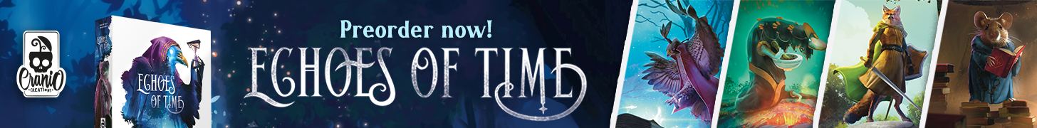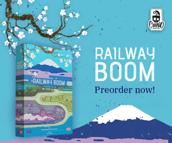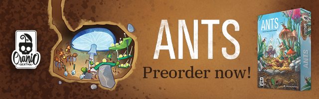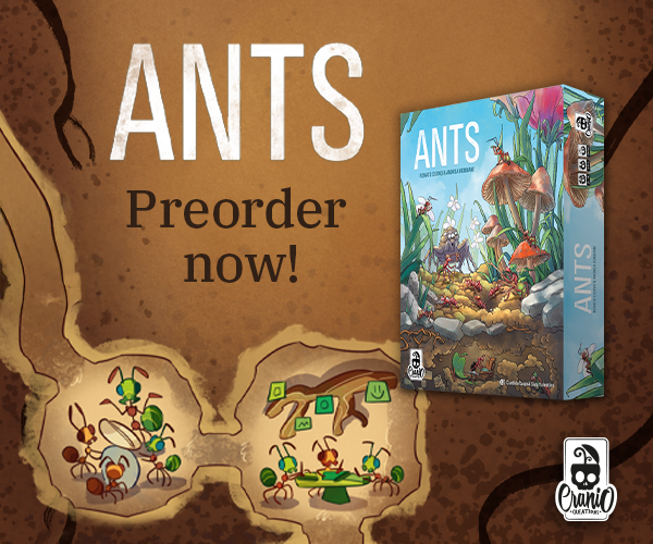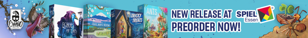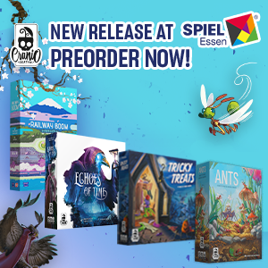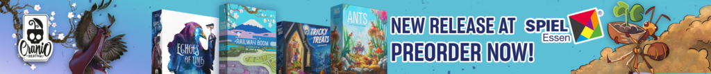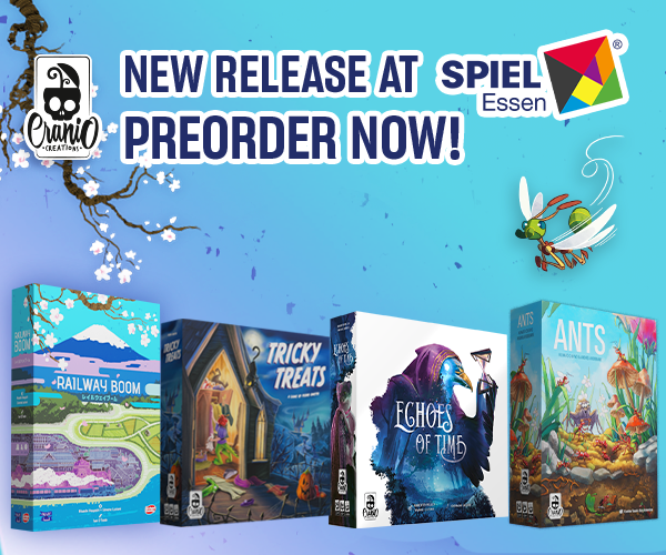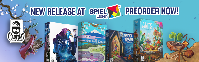 | Text | Here we are with Cranio Creations Spiel 25 release! Echoes of Time, Create your fellowship to conquer the sources of power and control the flow of time! Ants, Command your colony in the never-ending battle for dominance over the garden! RailwayBoom, Lay your tracks to revolutionize the Japan railway industry! Tricky Treats, Dress up your children with funny and colorful costumes to collect sweets and play tricks! You can choose to have the games shipped directly to your home or pick them up at our booth 3T400 at Spiel. Preorder now the new games to secure your copy! |