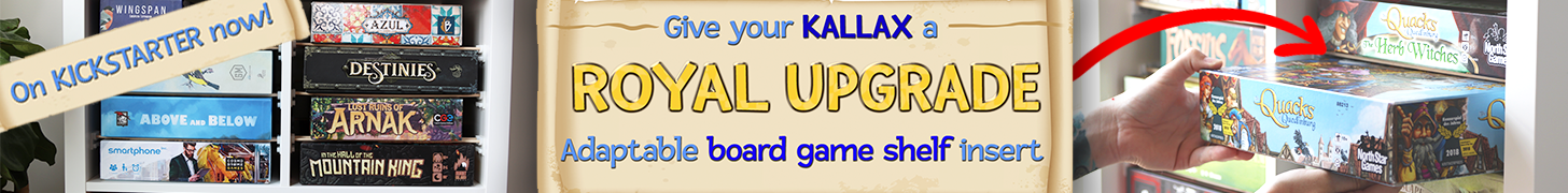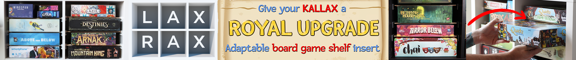 | Text | Stacking games flat in your Kallax? Stop wiggling and shuffling! Vertical storage? Drifting lids are a NIGHTMARE! Long gone are the days of choosing between horizontal and vertical storage. With LAX RAX, every game can finally get its own shelf. From the makers of BoxThrone comes an adaptable, affordable board game shelf insert for IKEA Kallax and cube shelves! Give your Kallax a ROYAL UPGRADE, with these perfectly aligned shelf grips that turn your collection into a dazzling array. What's more you'll be able to create your own miniature display with our glass-like acrylic shelves, or store small games more space efficiently with drawers. |