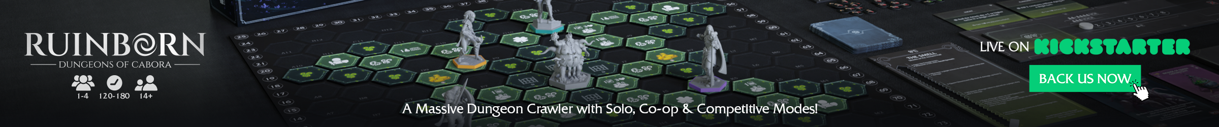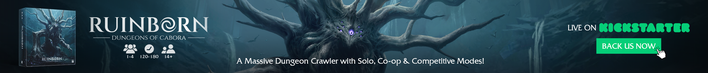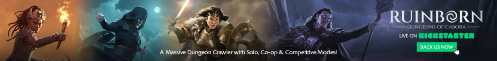 | Text | Ruinborn: Dungeons of Cabora, a massive dungeon crawler featuring a cut-throat combat, modular map design, 8 unique playable characters, hundreds of builds, and grand bosses in three gorgeous, hand illustrated biomes. Whether you fight side by side or stab your allies in the back, your descent into Cabora will not leave you unscathed. Ruinborn is live on Kickstarter, back now! |