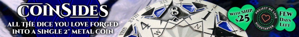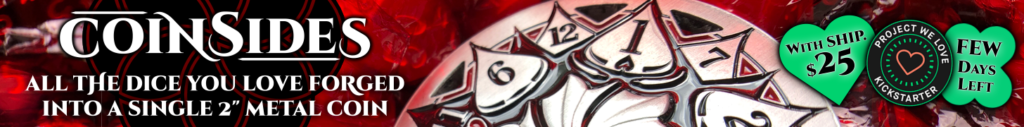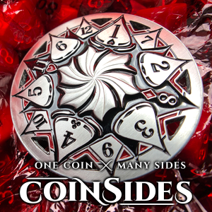 | Text | CoinSides is a stunning, multi-functional, and easy-to-use $25 LUXURY GAMING ACCESSORY that forges all the dice you love into a beautiful 2" metal coin. We are proud to launch this CoinSides Kickstarter campaign with an ALL IN approach. Every product includes shipping, retail quality packaging, a screen printed velvet drawstring bag, and a metal marker to help track stats. CoinSides has perfectly balanced D4, D6, D8, D10, D12, and D20 dice merged into a single coin and can be used as a 1-50 Life Counter (MtG), first player marker, jewelry, and more. All pledges are limited and close on November 15th. |