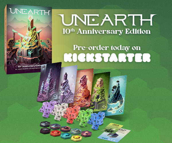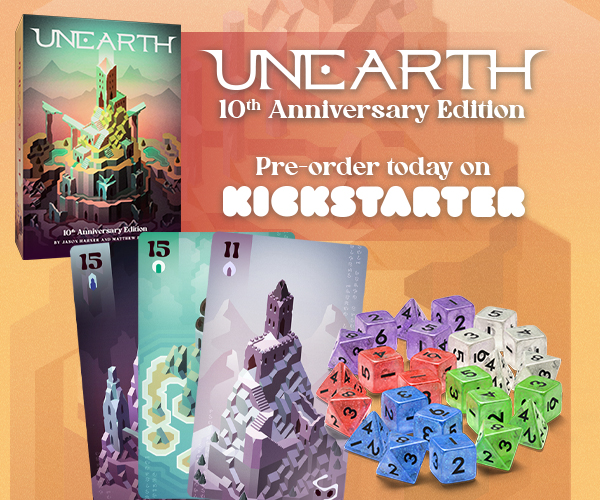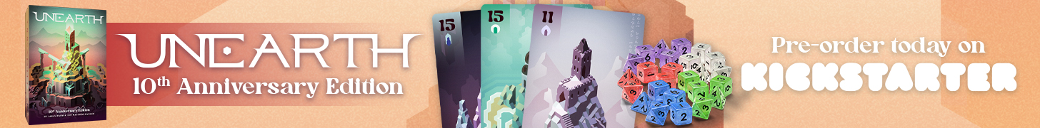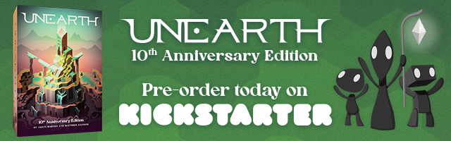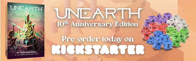 | Description | The original bend-your-luck game is back in this Kickstarter exclusive 10th Anniversary Edition. Unearth: 10th Anniversary Edition features modernized graphic design, new expansion content, and updated gameplay. All in one box! |
