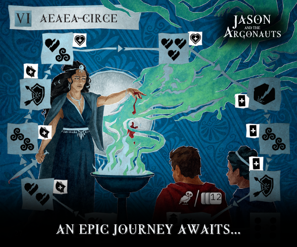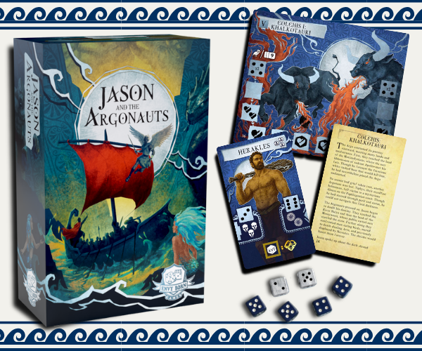 | Description | Jason and the Argonauts is a deeply thematic solo Greek mythology dice rolling, dice manipulation boss battler. Featuring stunning illustrations, silver foil cards, and extra-large cards. Face legendary trials and sail for the Golden Fleece in an epic journey. |