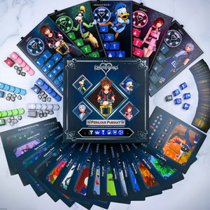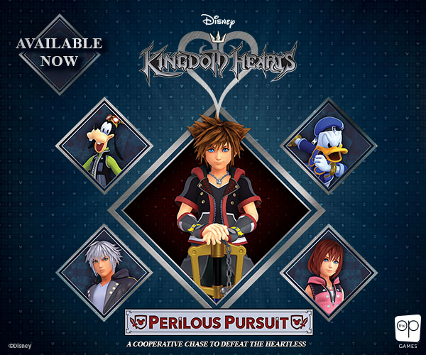 Text Harness your heroic skills to save Traverse Town, Destiny Islands, Disney Castle, and other sacred lands from being dominated by these destructive beings and prove the unbeatable power of friendship in Disney KINGDOM HEARTS Perilous Pursuit. Play as Sora, Goofy, Donald Duck, Kairi, or Riku and face unpredictability around every corner in this cooperative dice game as you try to seal the Doors of Darkness and defeat the Heartless. Only with determination and the best use of luck and strategy can each character activate the skills and abilities needed to reclaim the Realm of Light! Available online now and in stores!