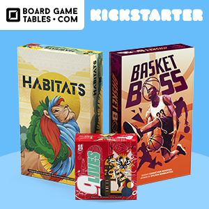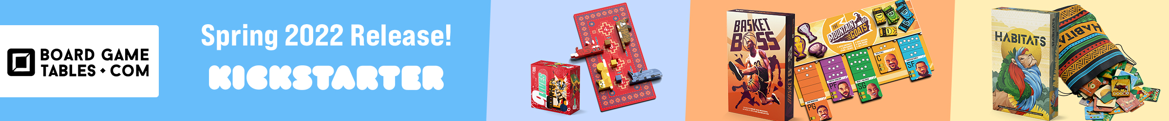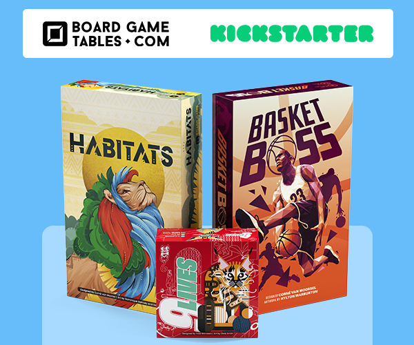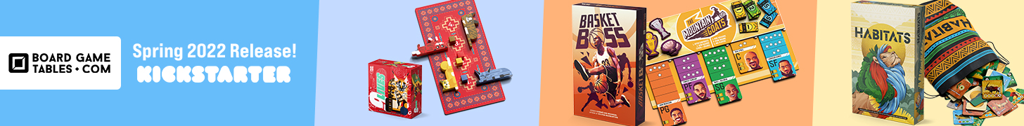 | Text | The first Spring 2022 Games release from BoardGameTables includes Habitats, BasketBoss, and Nine Lives! Habitats is dual-strategy public market meets tile-laying extravaganza. BasketBoss puts you right into the hot seat as you acquire players during auction and draft special advisors. Nine Lives is a Japanese trick-taker where you can see everyone's suits and have to place exact bets to earn nine or more lives! The campaign ends soon, check it out today! |