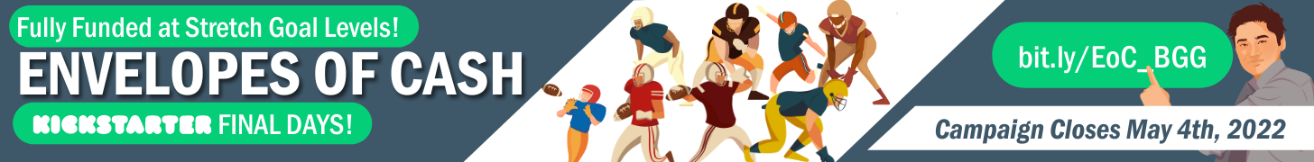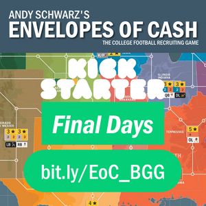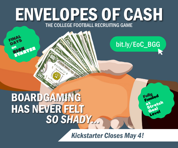 It's the final week to back Envelopes of Cash's fully funded Kickstarter, which closes on May 4. EoC is a mid-weight Euro with a very American theme: college football recruiting. Players take the roles of Head Coaches at major college football programs earning high salaries to exploit unpaid labor. They must attract valuable high schoolers to their college programs, using all the tools available to them: envelopes of cash, donations from boosters, and marketing campaigns, all to maximize their Recruiting Points. With 120 different cards and a different mix of recruits across regions each time, the game offers high replay value.