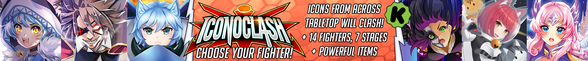 | Text | Iconoclash is a table-top platform fighting game inspired by Super Smash Bros. Face your opponents on one of several maps as you utilize strategic movements to put yourself in the best position to either acquire powerful items or execute abilities against your foes to push them out of bounds! Choose a fighter from one of the multiple tabletop titles, such as LevelMAX, Battlegrounds, Cross-Dimension Zero, and Castle Clash. Not to mention Iconoclash’s own intriguing characters. Each fighter is brimming with personality and utilizes their own unique style in dishing out a thrashing on their opponents. Who will you be? |