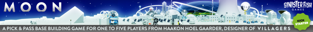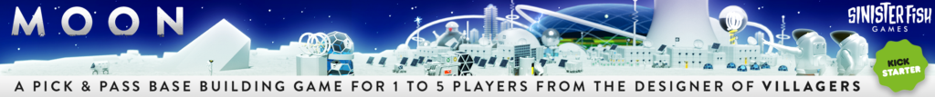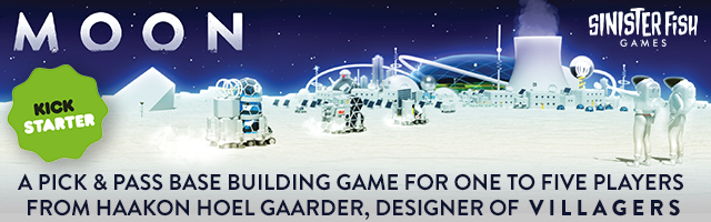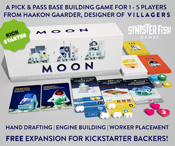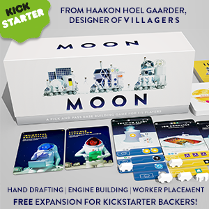 | Description | Moon is the final game in the trilogy that began with Villagers & Streets. Players construct lunar bases in competition to become the capital city of the moon! It's a snappy 1-5 player pick & pass game of engine building & worker placement with many ways to score. |